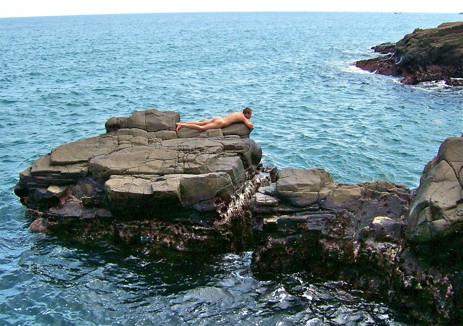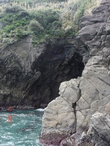 Moreover, you can combine this also with more traditional naturist activity: going to a beach.It seems there are no official naturist beaches in Japan, but Izu peninsula has a lot of sandy and flat rock beaches with warm water and wet subtropical forest around. They are not too crowded, and in the beginning of September it was easy to find a secluded spot. I can recommend visiting flat rocks at Kawazu. They are indeed convenient to dive in the water, as the entrance to water is steep, and then, to lie on, because they are roundish and pleasantly warm. The ocean water is warm too, though the sea weeds rather resemble those of cold northern seas. The view is magnificent and there is also an impressive cave where you can swim