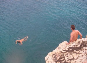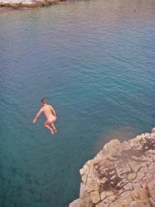 Με διασκεδαστική διάθεση, την μέρα που πήραμε το κουράγιο να πηδήξουμε από τα βράχια, υπήρχε στη διπλανή λίμνη της Βουλιαγμένης διαγωνισμός των 12 καλύτερων καταδυτών βράχου. Εμείς δεν μπορούσαμε πραγματικά να συγκριθούμε μαζί τους, απλώς βουτήξαμε με έναν πιο φυσικό τρόπο, από τα βράχια και όχι από πλατφόρμα (γιατί άραγε το απόκαλούν κατάδυση βράχου) και χωρίς μαγίο ) (τα σπάσαμε λίγο, αλλά άξιζε!). Λοιπόν έτοιμοι?!